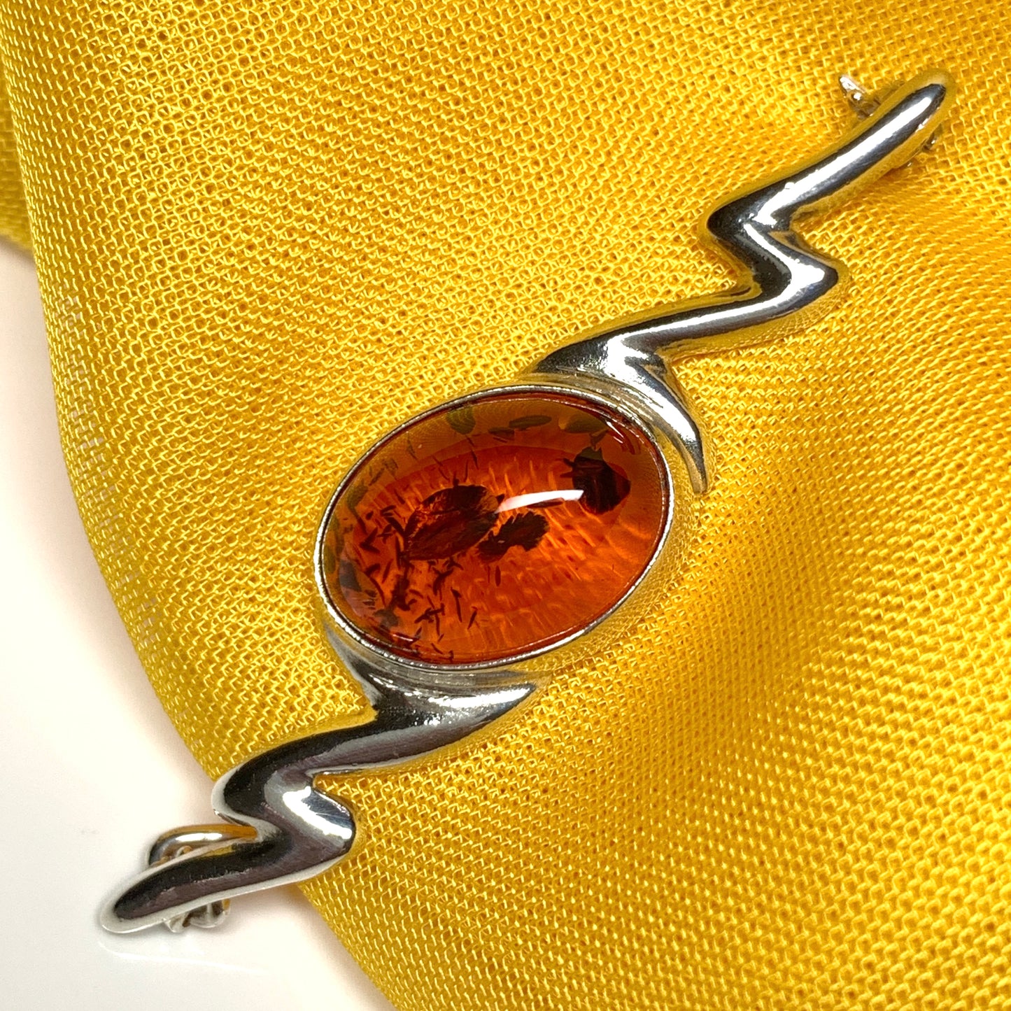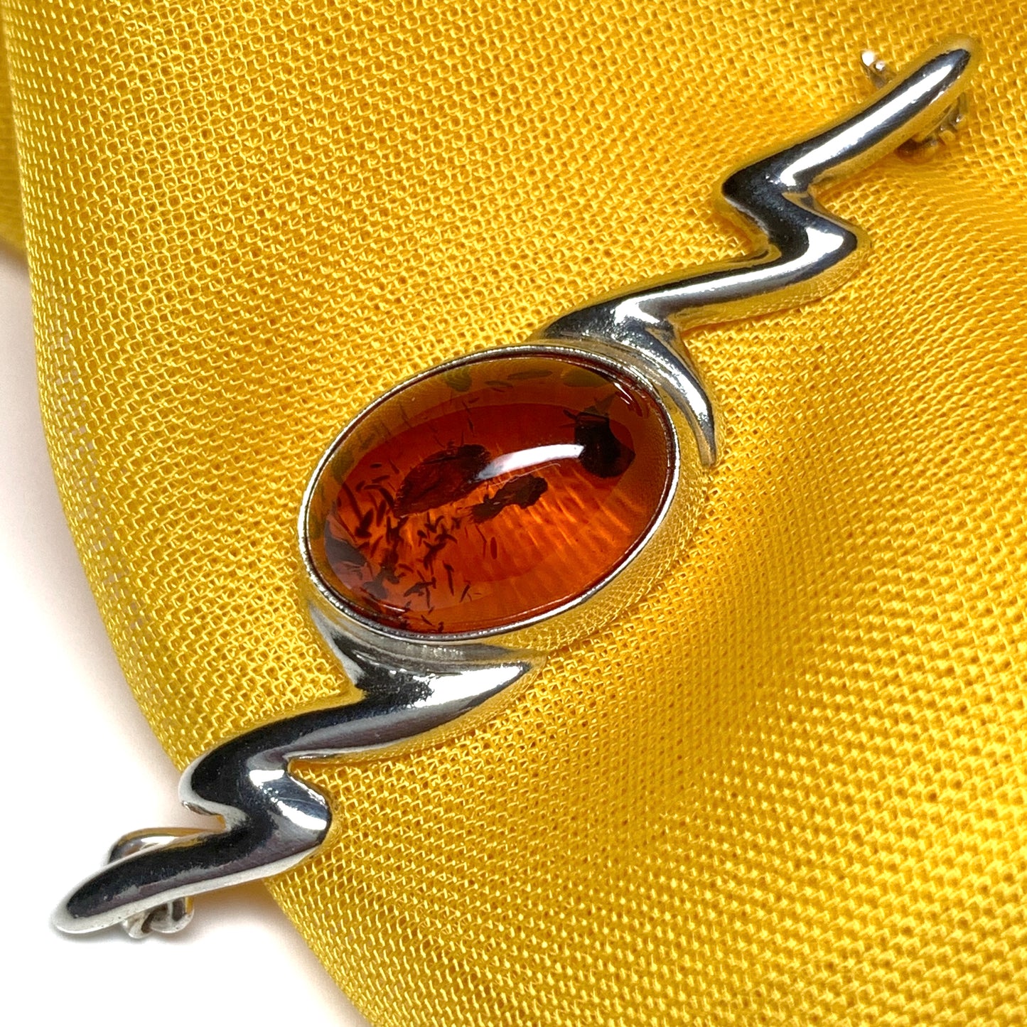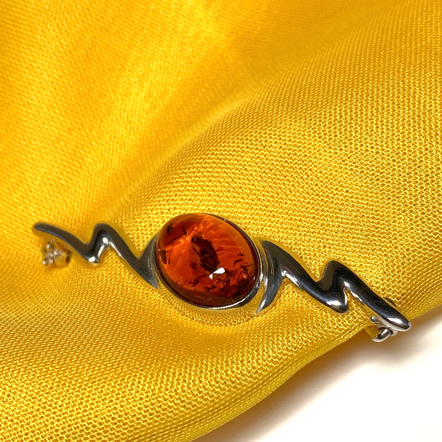 A beautiful zig zag sterling silver bar brooch with an amber stone at it centre. An oval orange amber stone in a rubbed over setting is edging with a zig zag sterling silver design feature either side of it