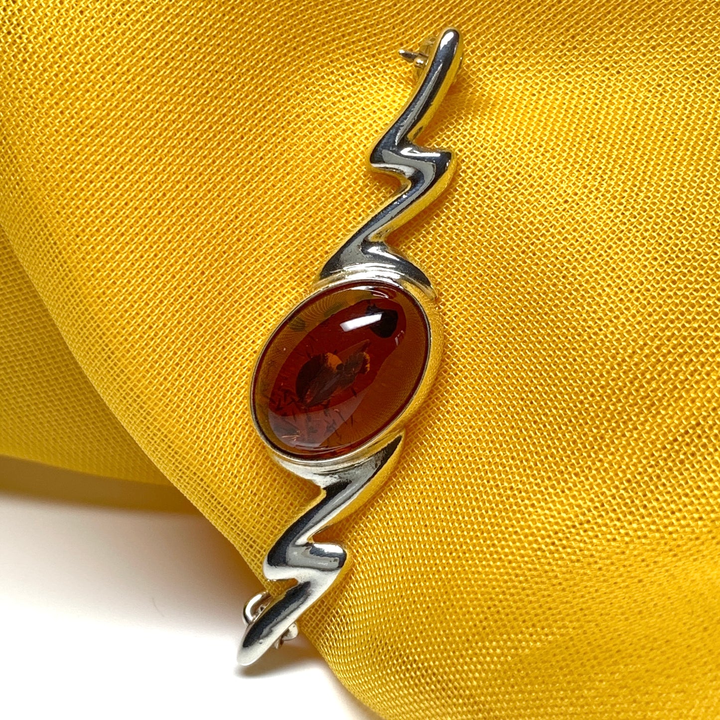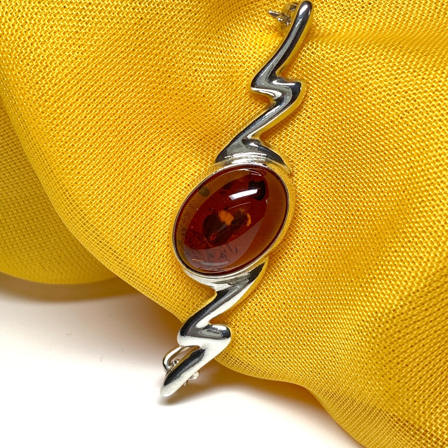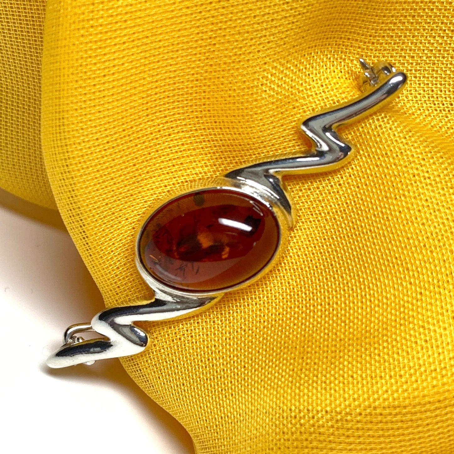 Made in shimmering 925 sterling silver with an oval cut piece of amber in the middle of a stunning zig zag design that will stand out and finish off that perfect outfit