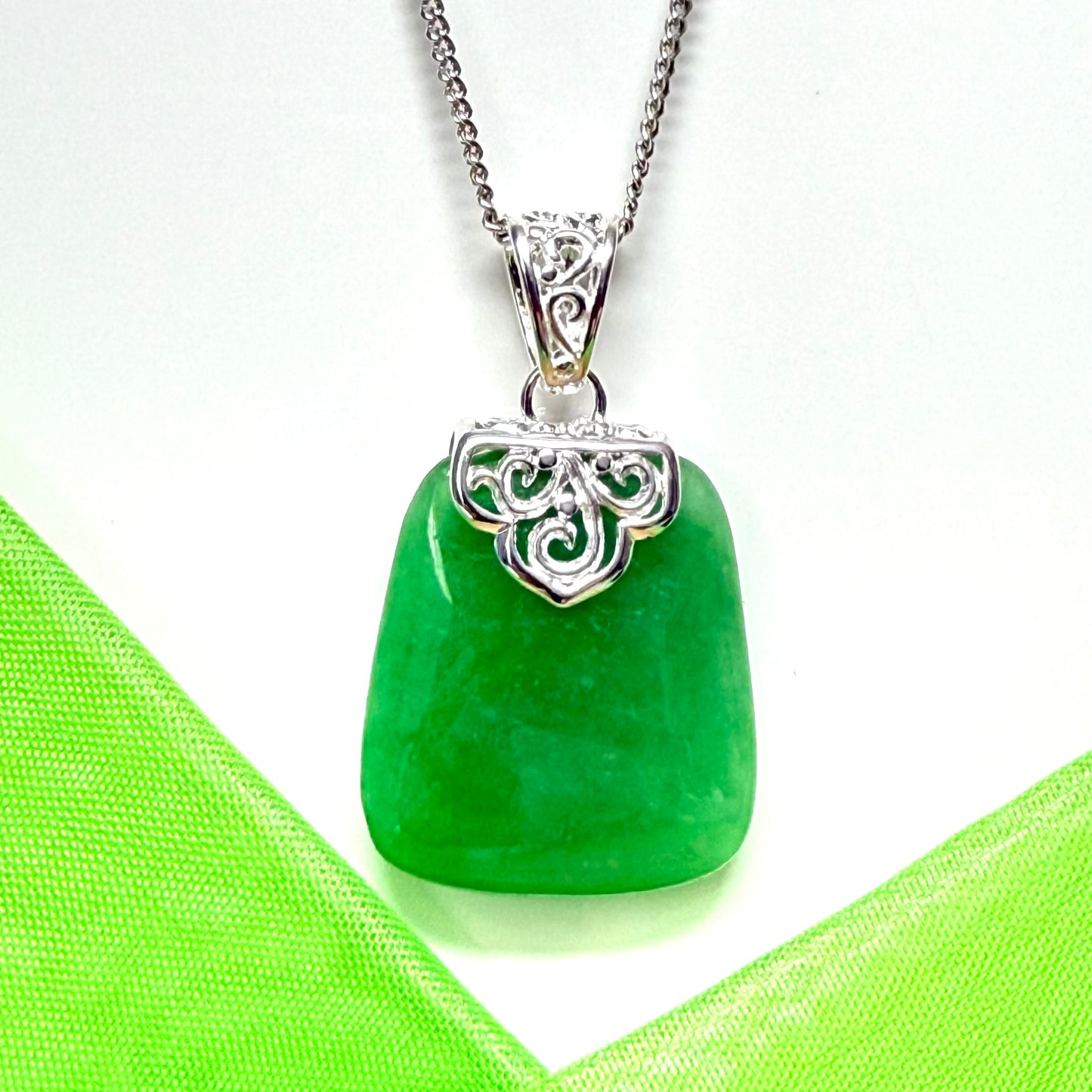This stunning necklace features a real dark green jade stone, cushion-shaped and set in a fancy patterned sterling silver setting