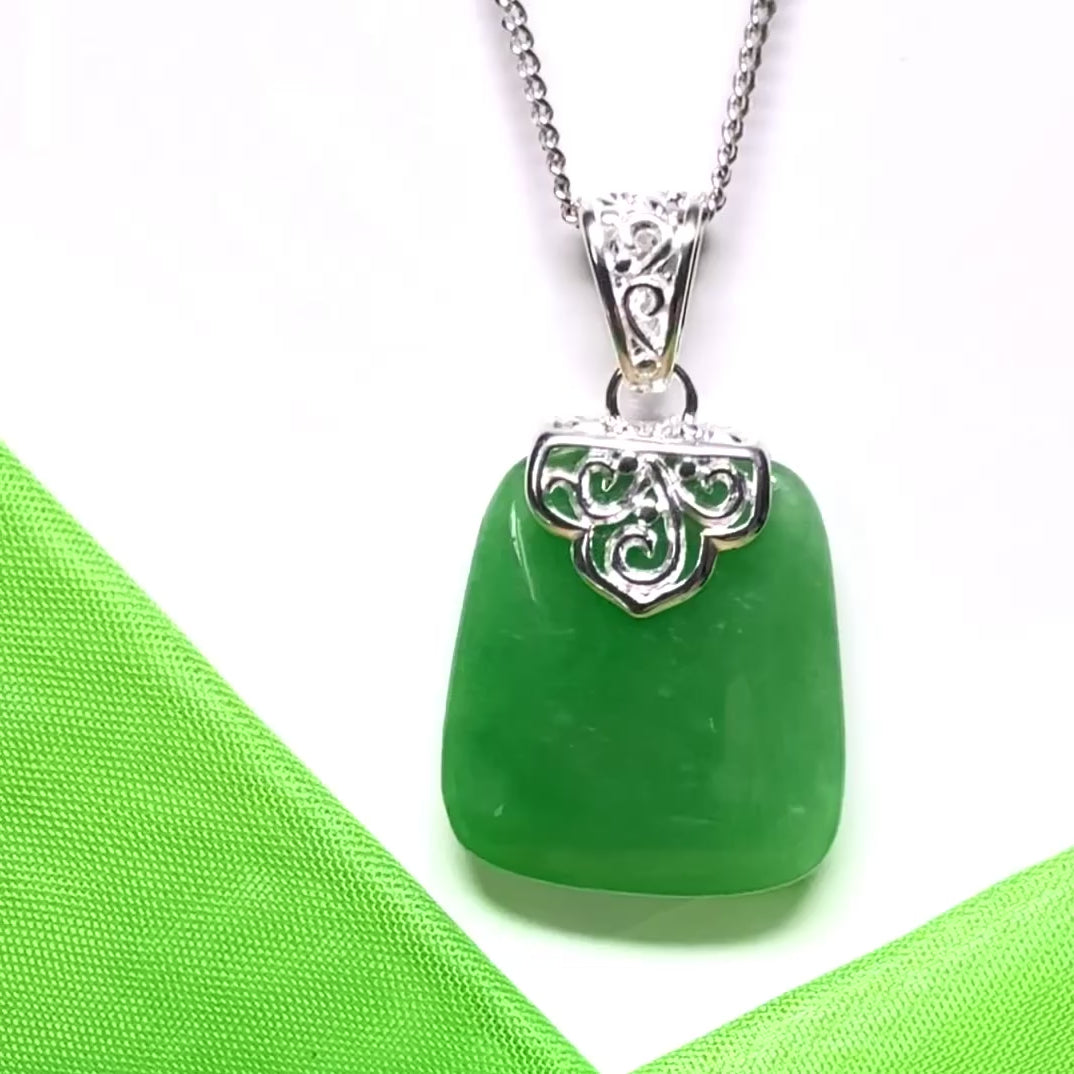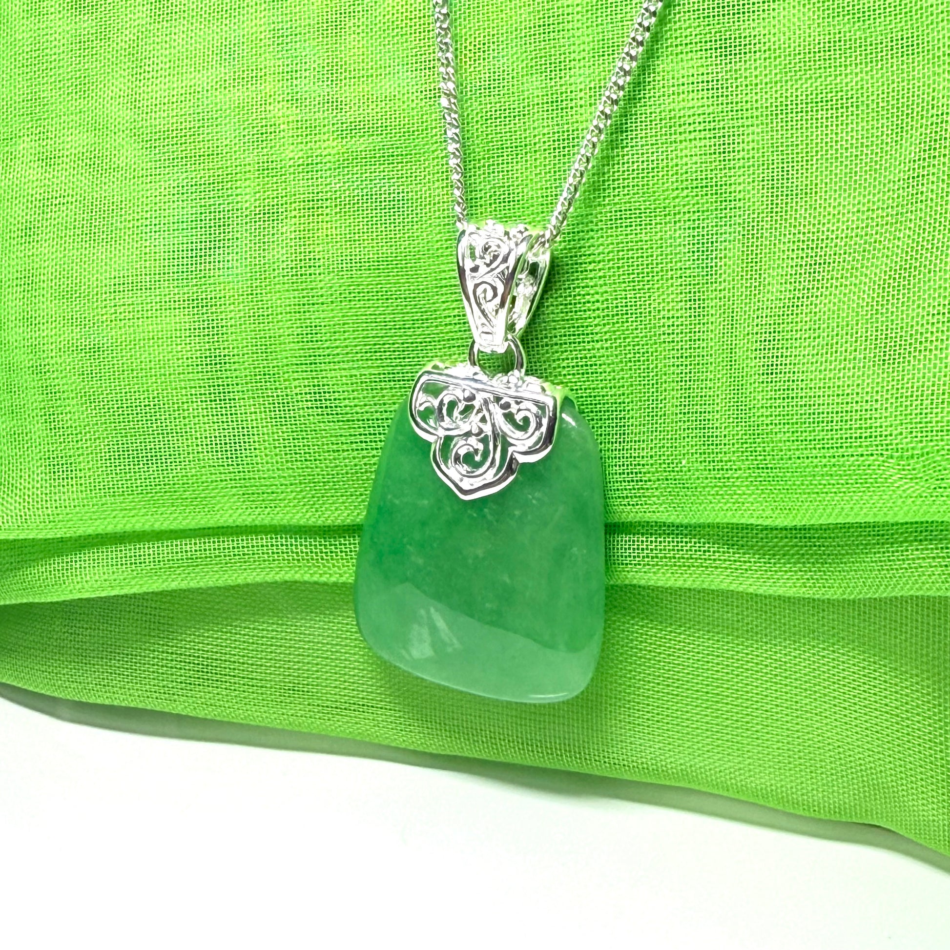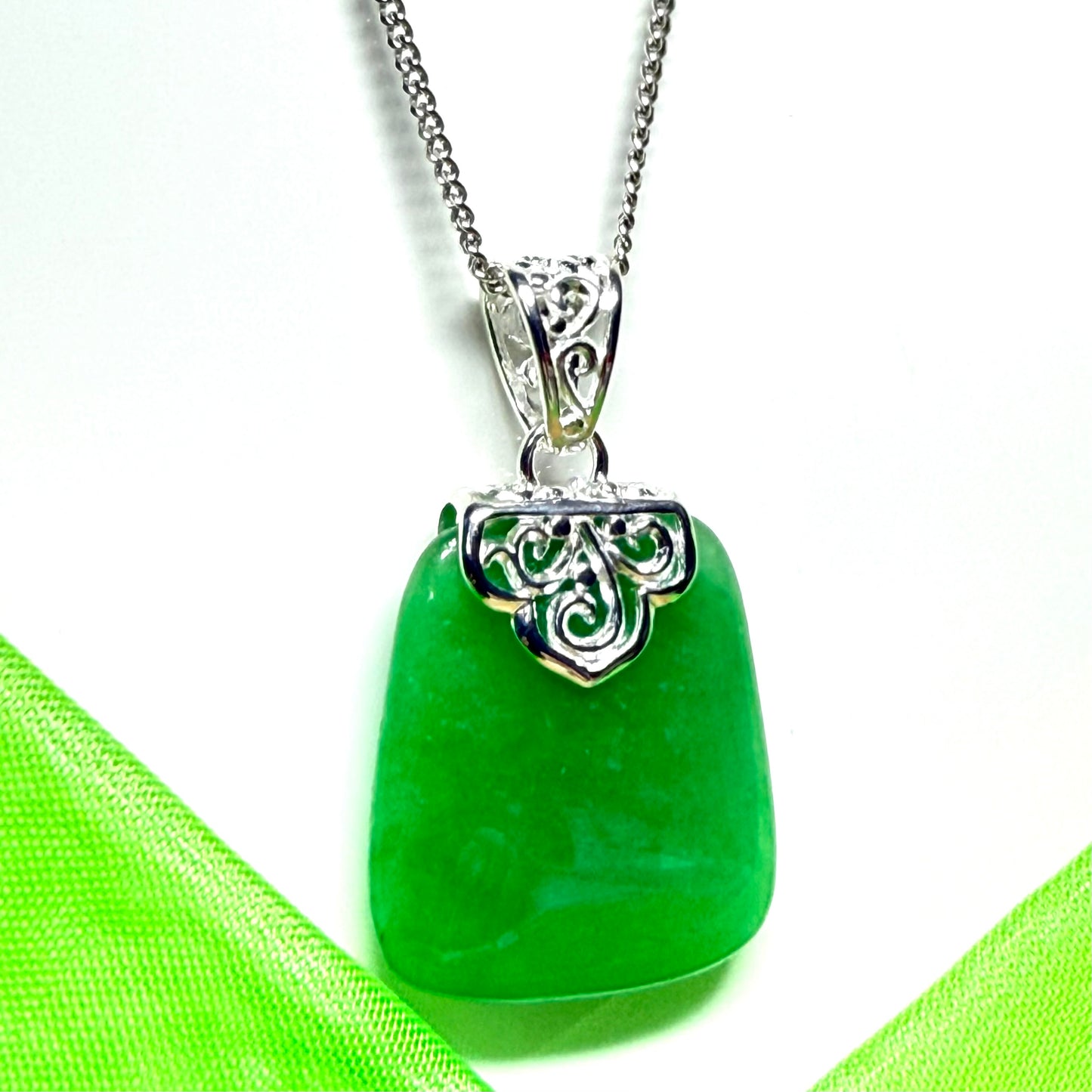 A timeless, elegance with this beautifully handcrafted real green jade pendant necklace, featuring a richly coloured, cushion-cut green real jade stone set in a fancy sterling silver patterned frame. A striking combination of traditional craftsmanship and natural beauty, this pendant captures your attention with its deep green hue and shimmering sterling silver setting