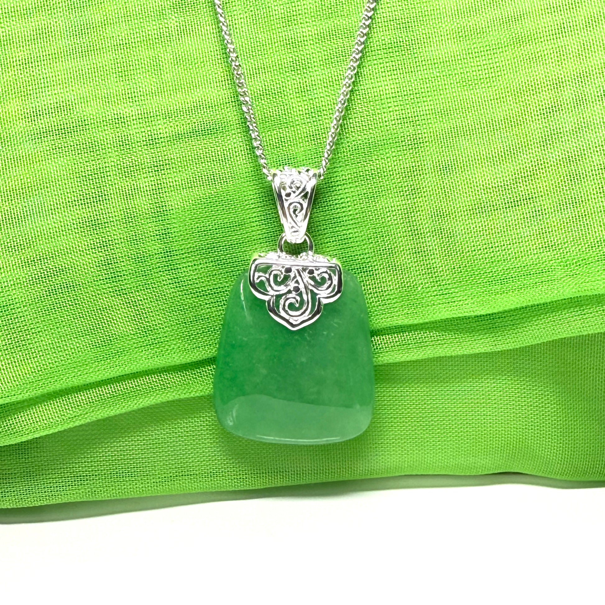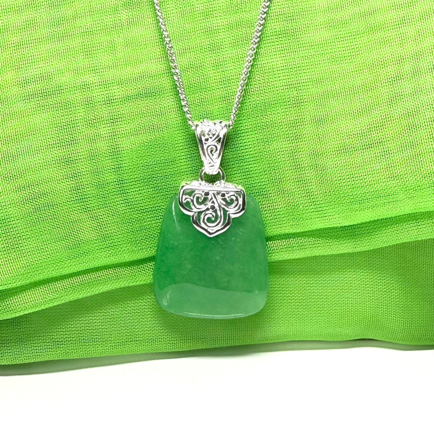A beautiful cushion shaped real green jade necklace in sterling silver, with a single cushion shaped real dark green jade stone in a fancy patterned setting