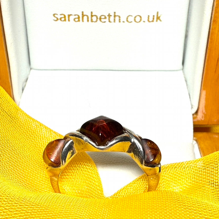 A stunning sterling silver orange and light orange amber three stone dress ring, with a single square cut light amber stone and two square cut darker amber stones, having a cross over setting