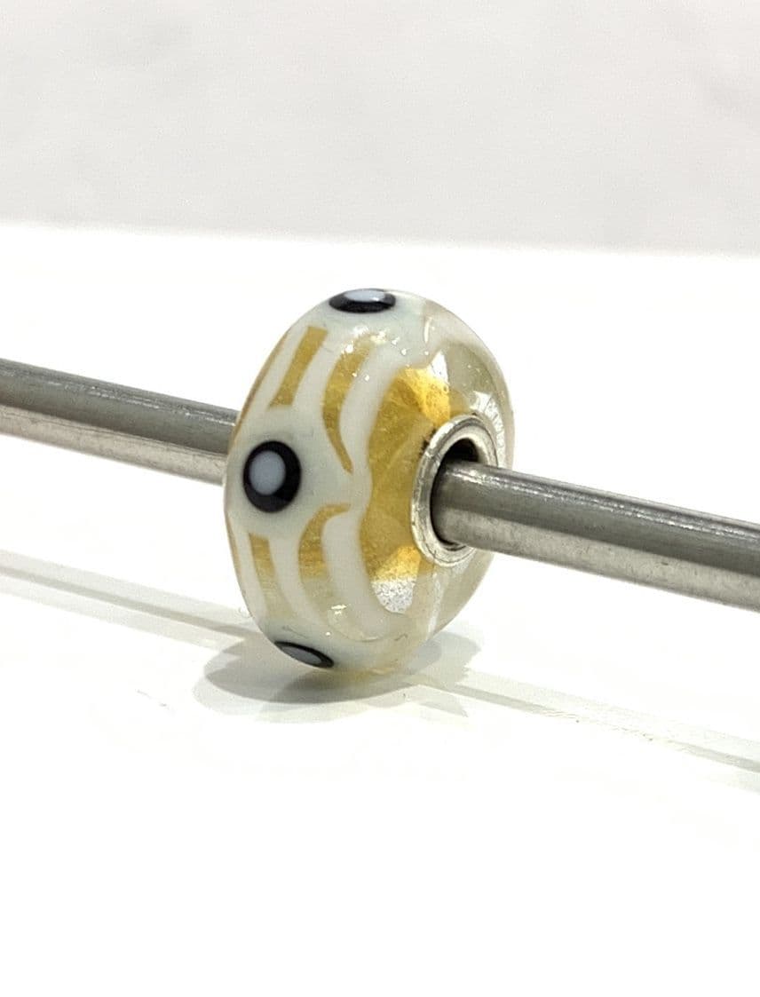 A stunning white and clear with black dots unique glass bead by Trollbeads, coming complete with a Trollbeads pouch, you can see even more detail in the video below.