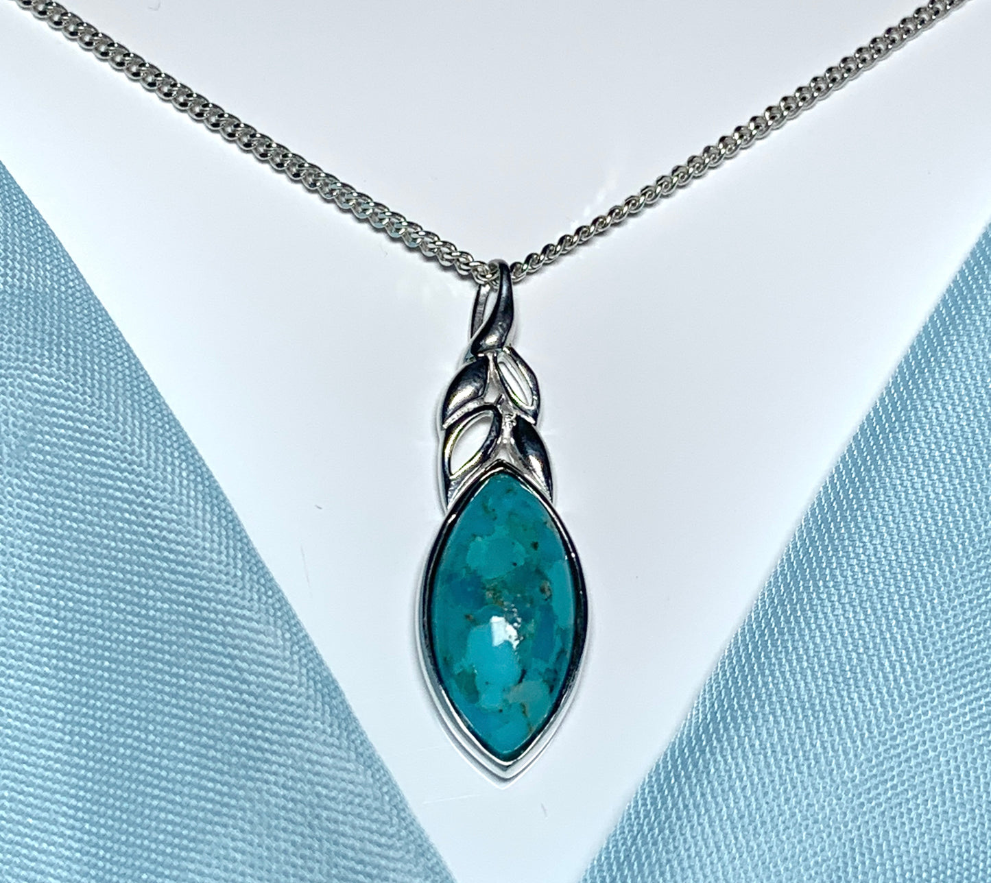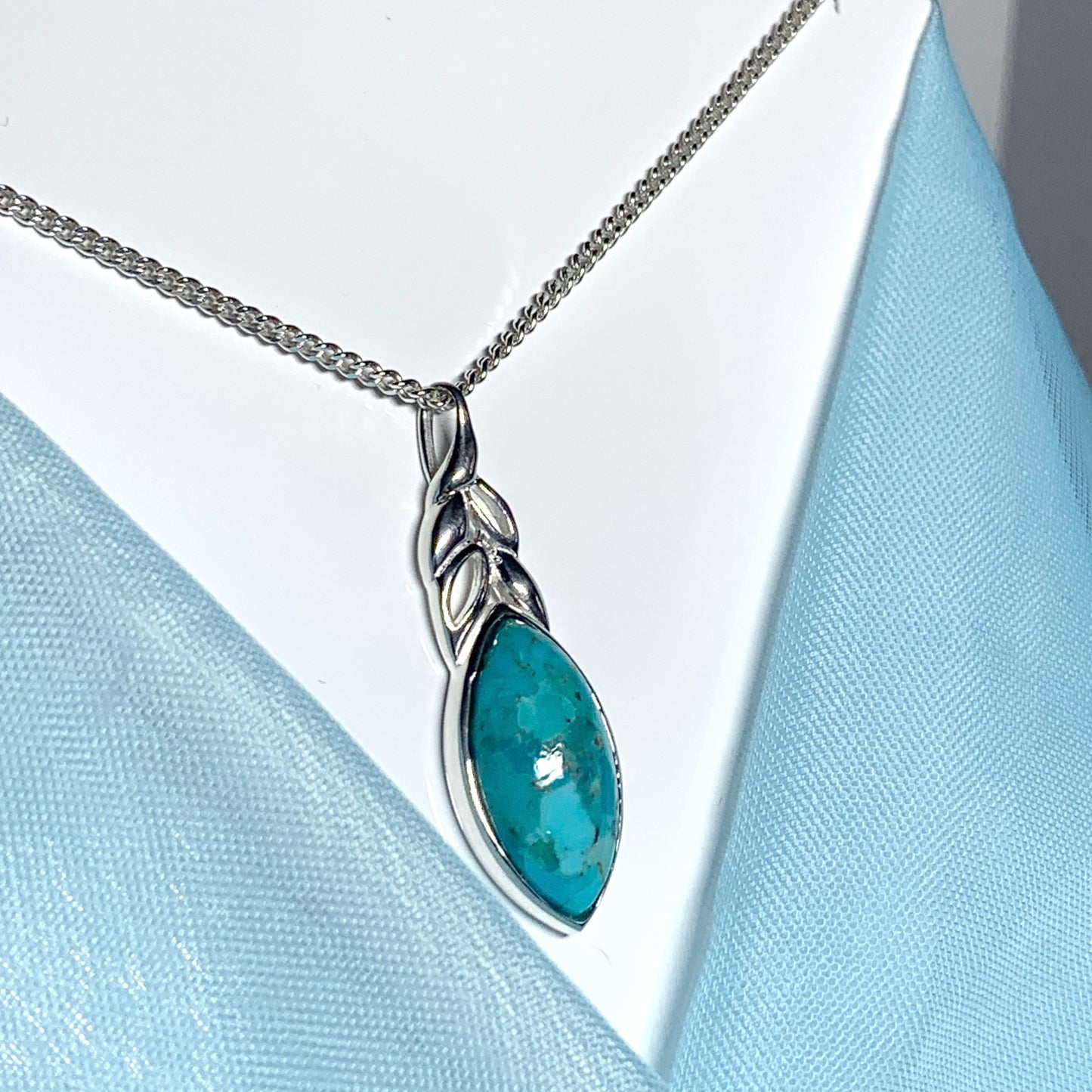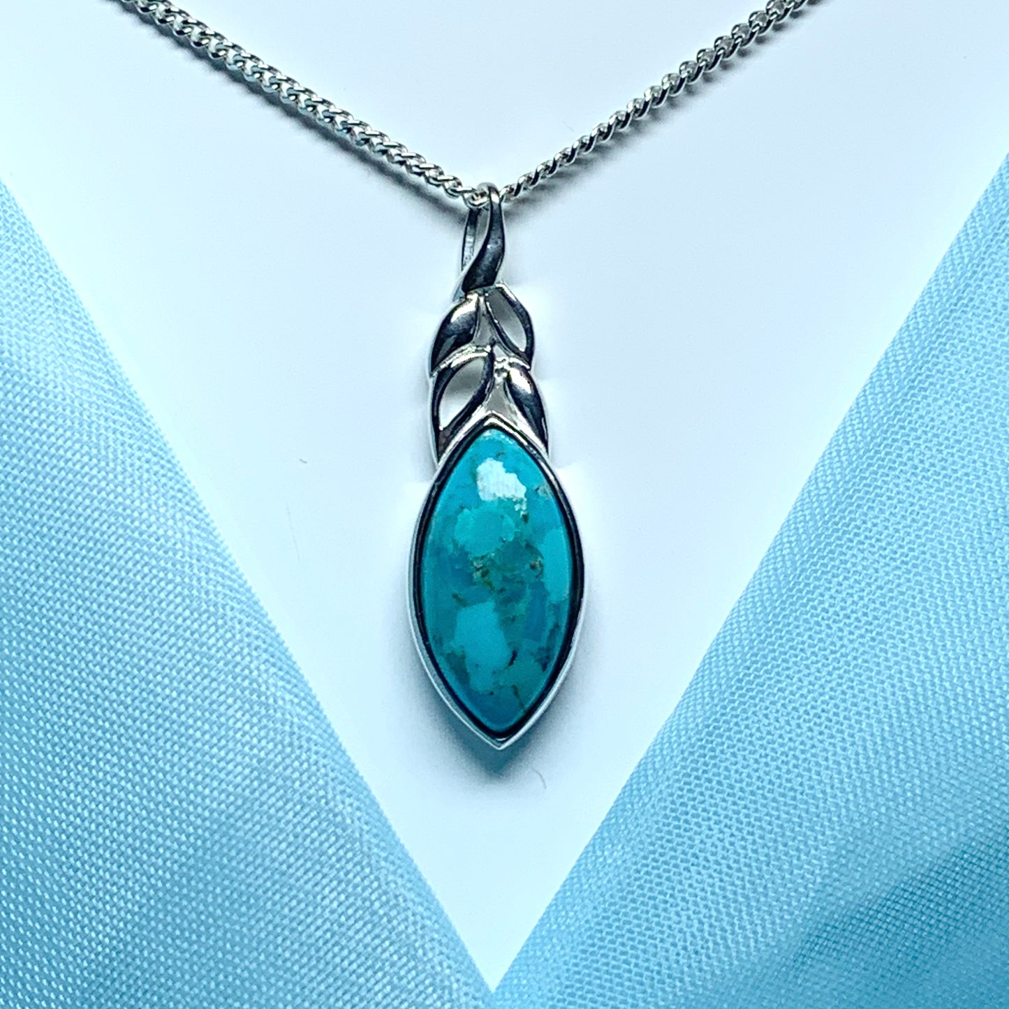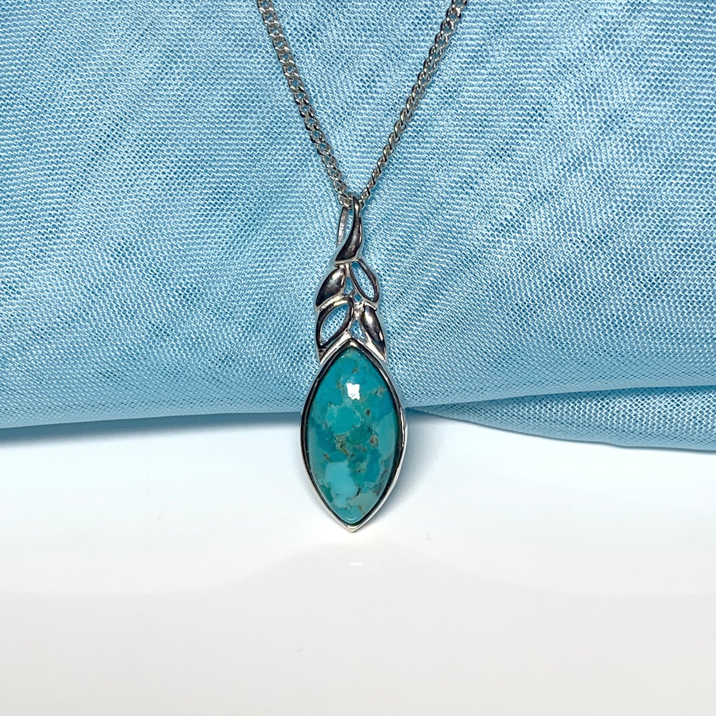 A beautiful sterling silver turquoise set necklace, with a marquise cut turquoise stone, with a solid sterling silver curb chain