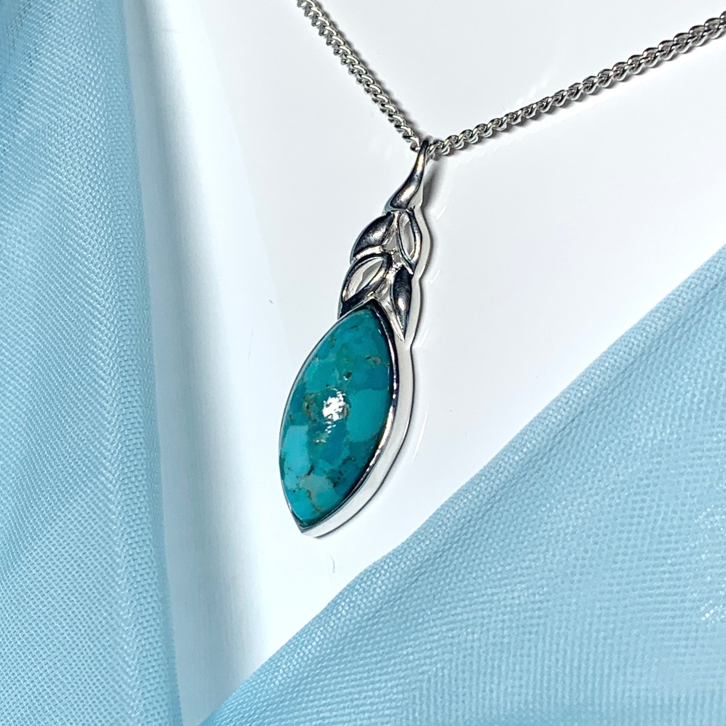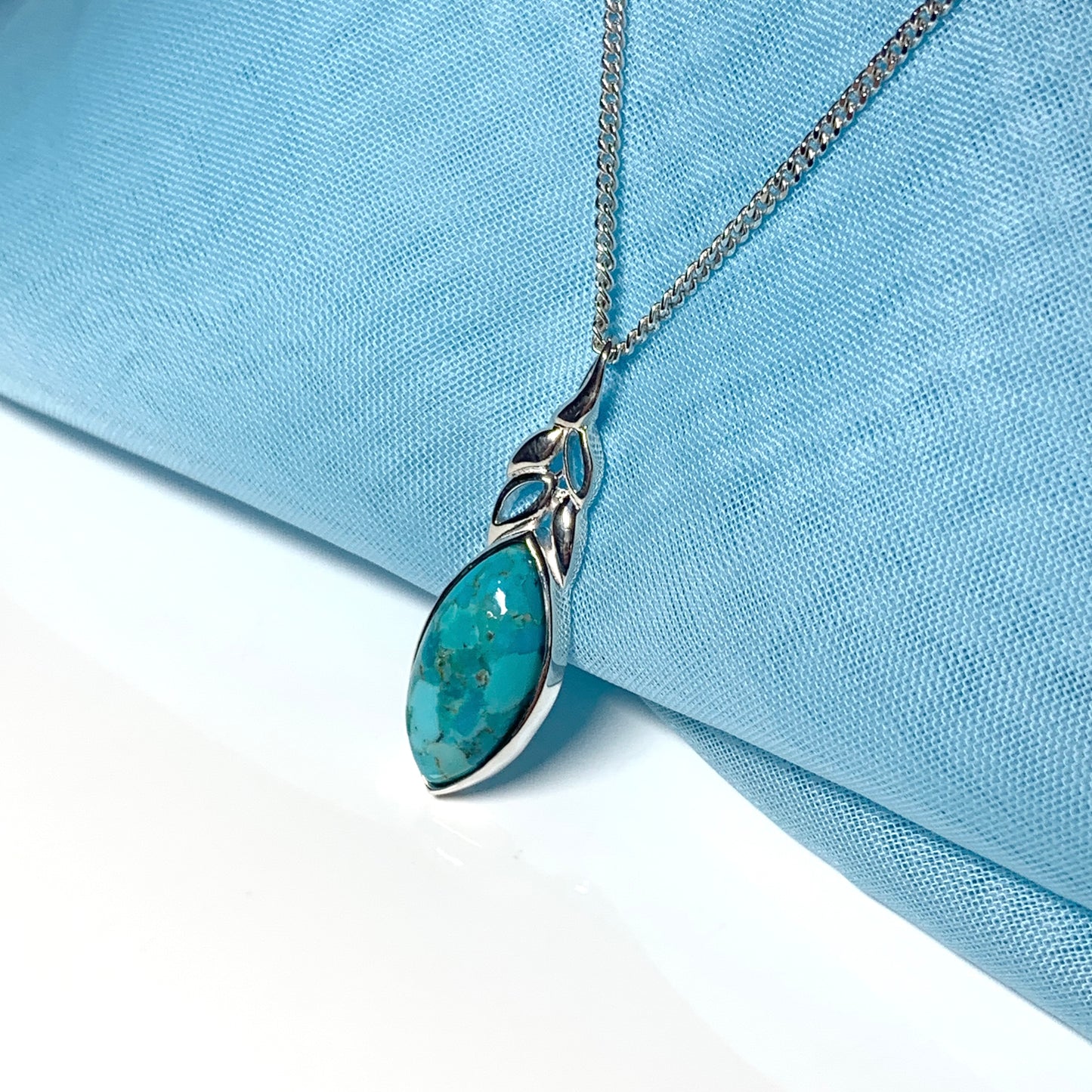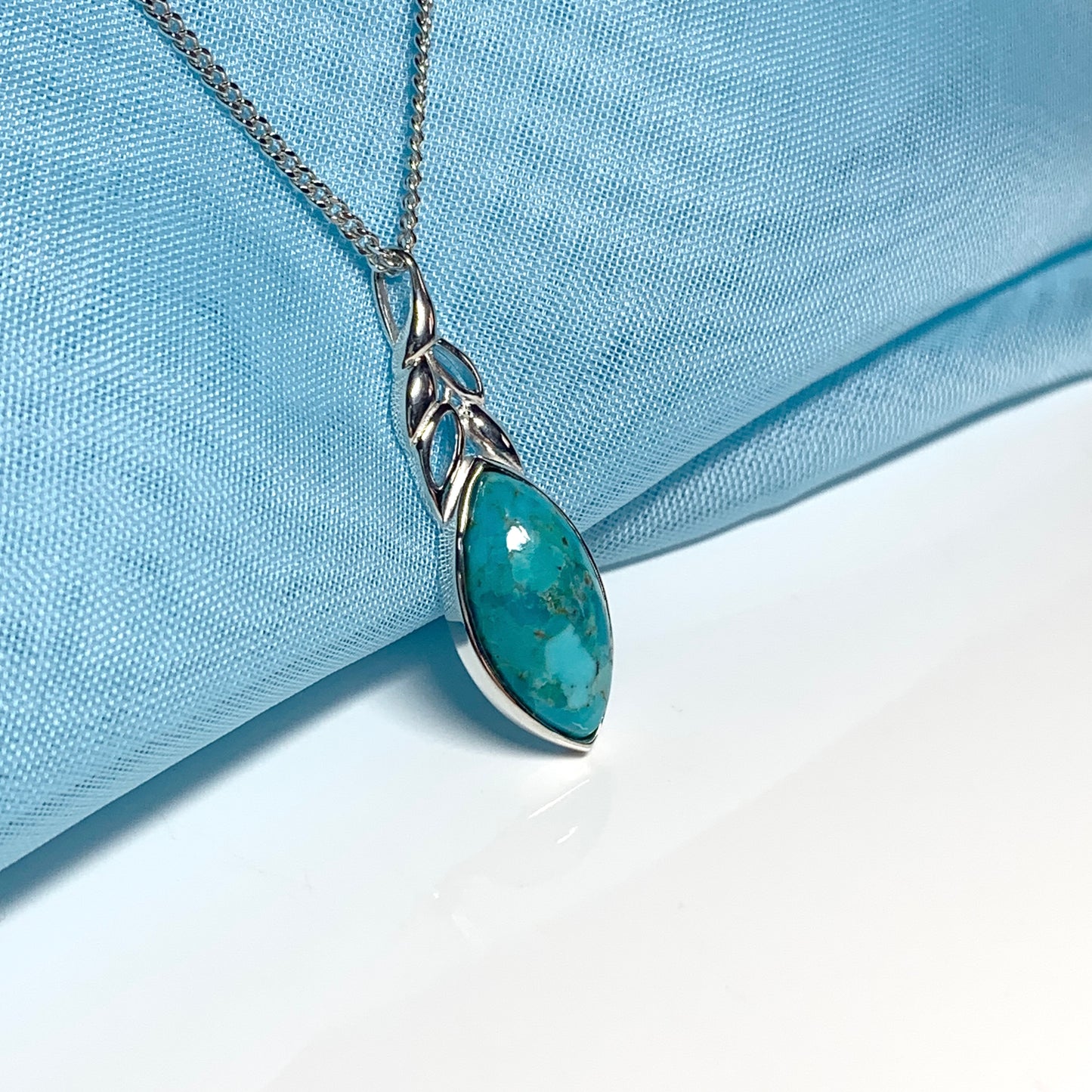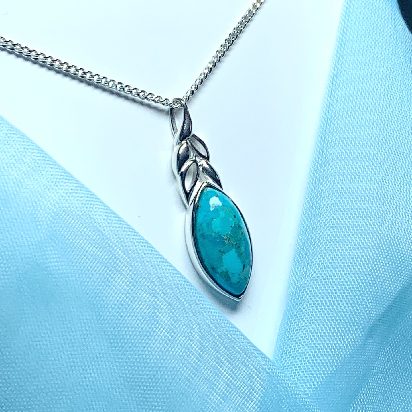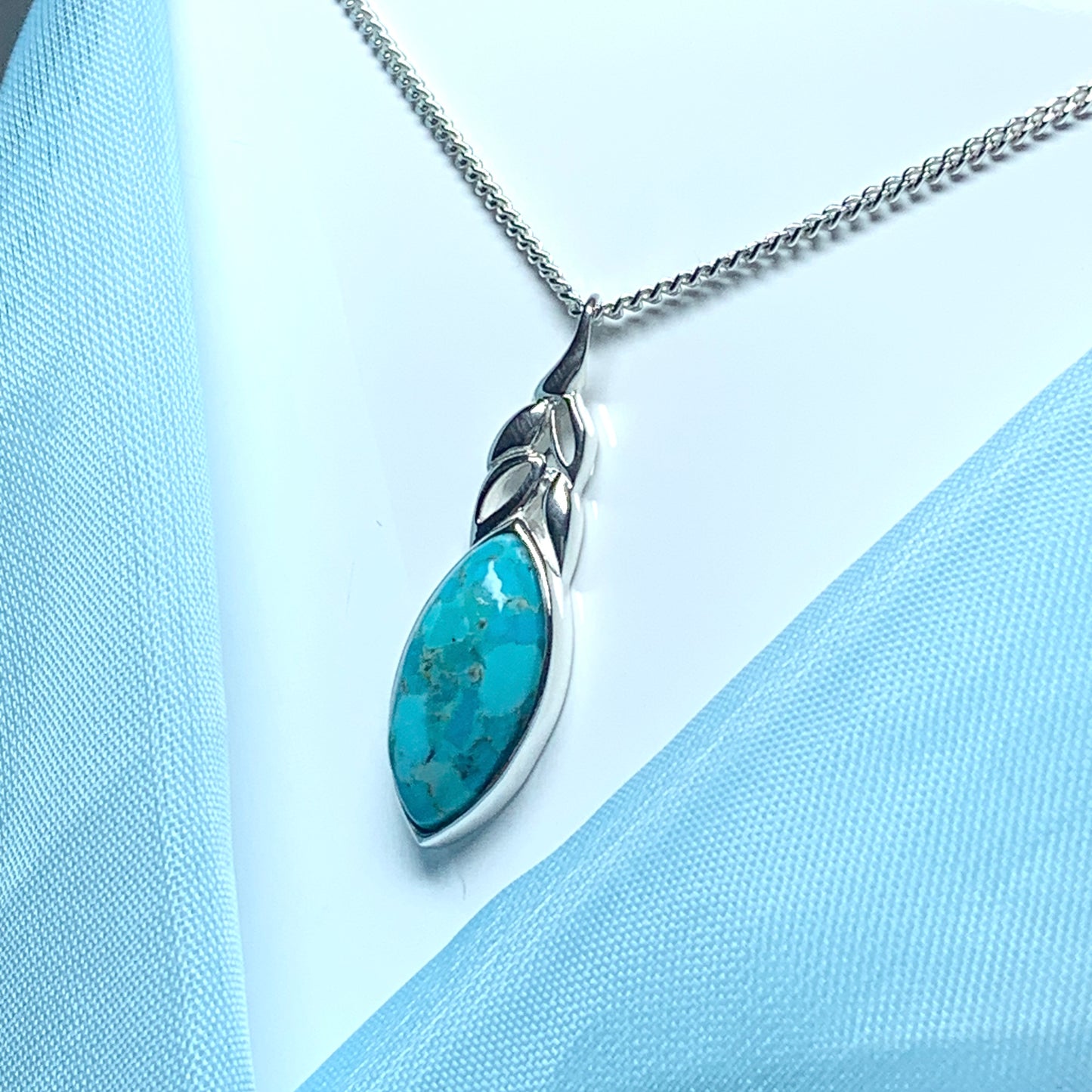 A beautiful sterling silver turquoise set necklace, with a marquise cut turquoise stone, with a solid sterling silver curb chain