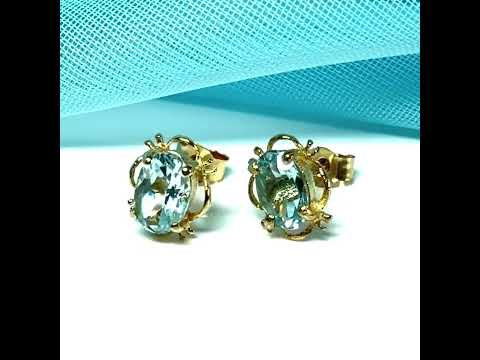 Yellow Gold Light Blue Topaz Stud Earrings Oval Shape
