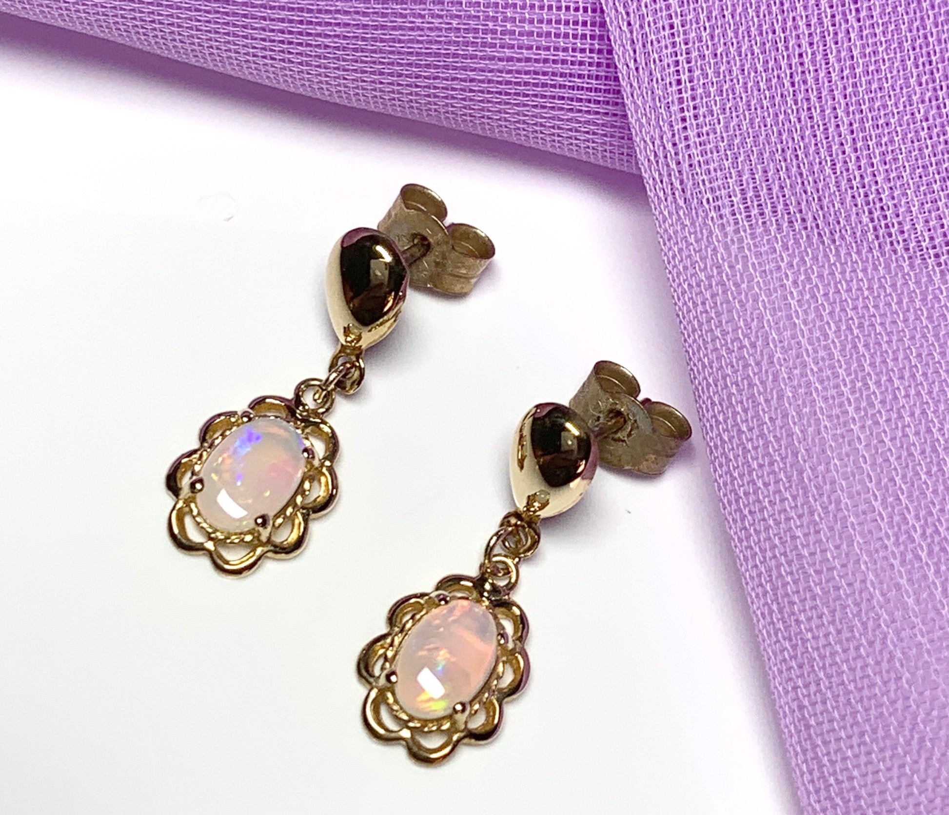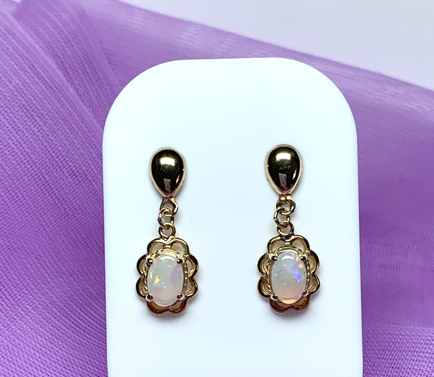 Yellow gold real opal oval drop earrings with a fancy edging