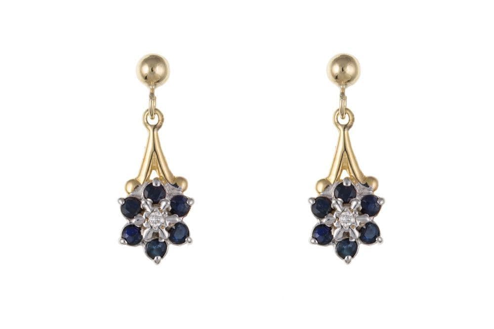 A beautiful pair of 9 carat yellow gold sapphire and diamond cluster drop earrings, with six round cut naturally mined real sapphire stones and a round cut naturally mined real diamond in the centre of them, with a butterfly and post fitting.
