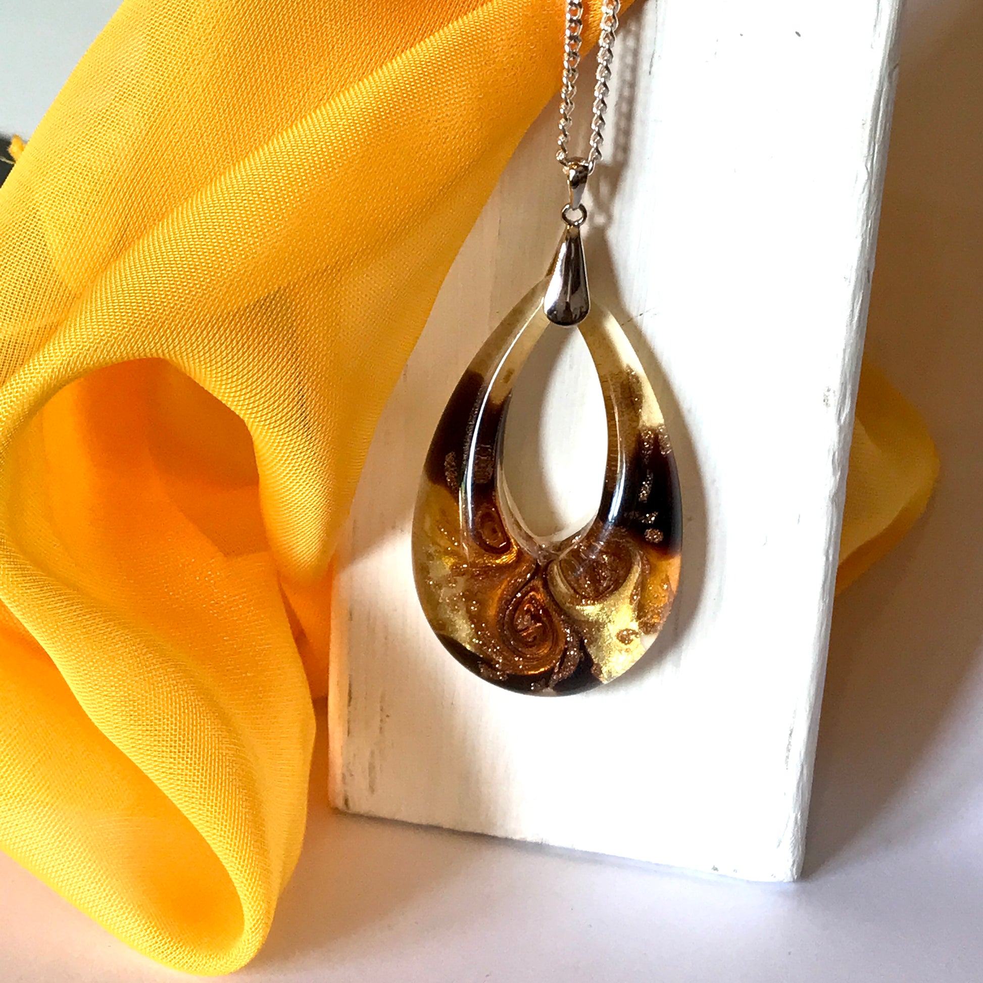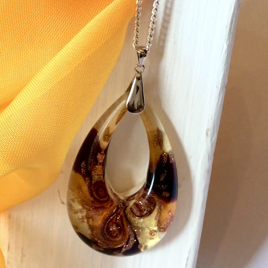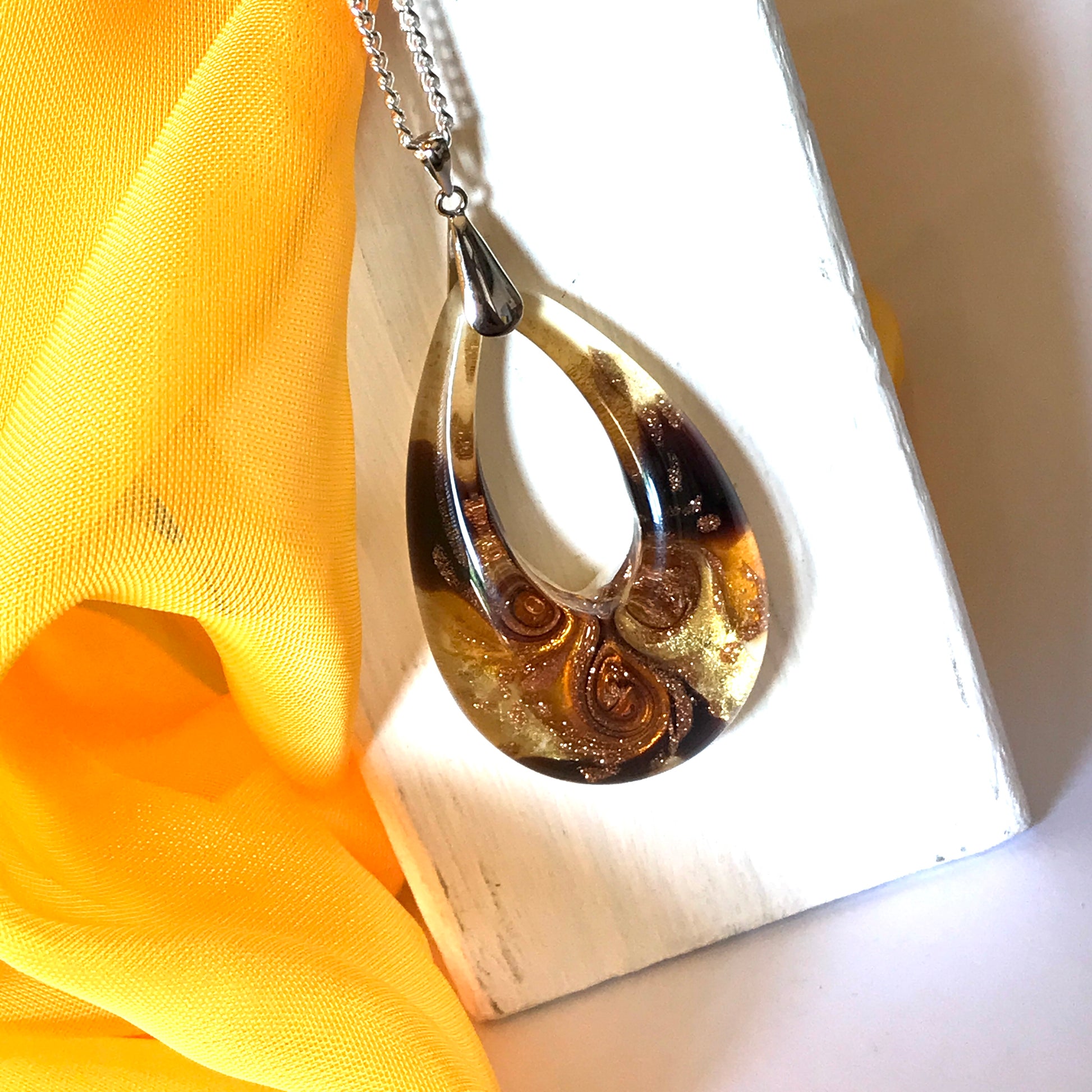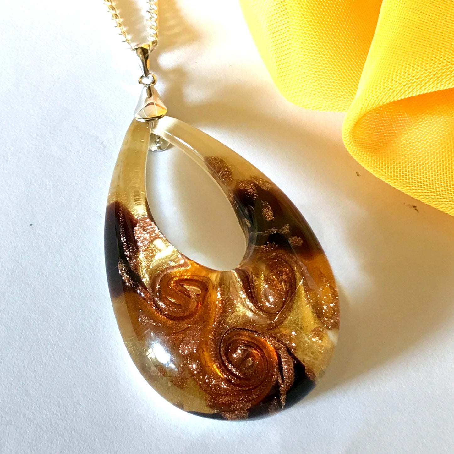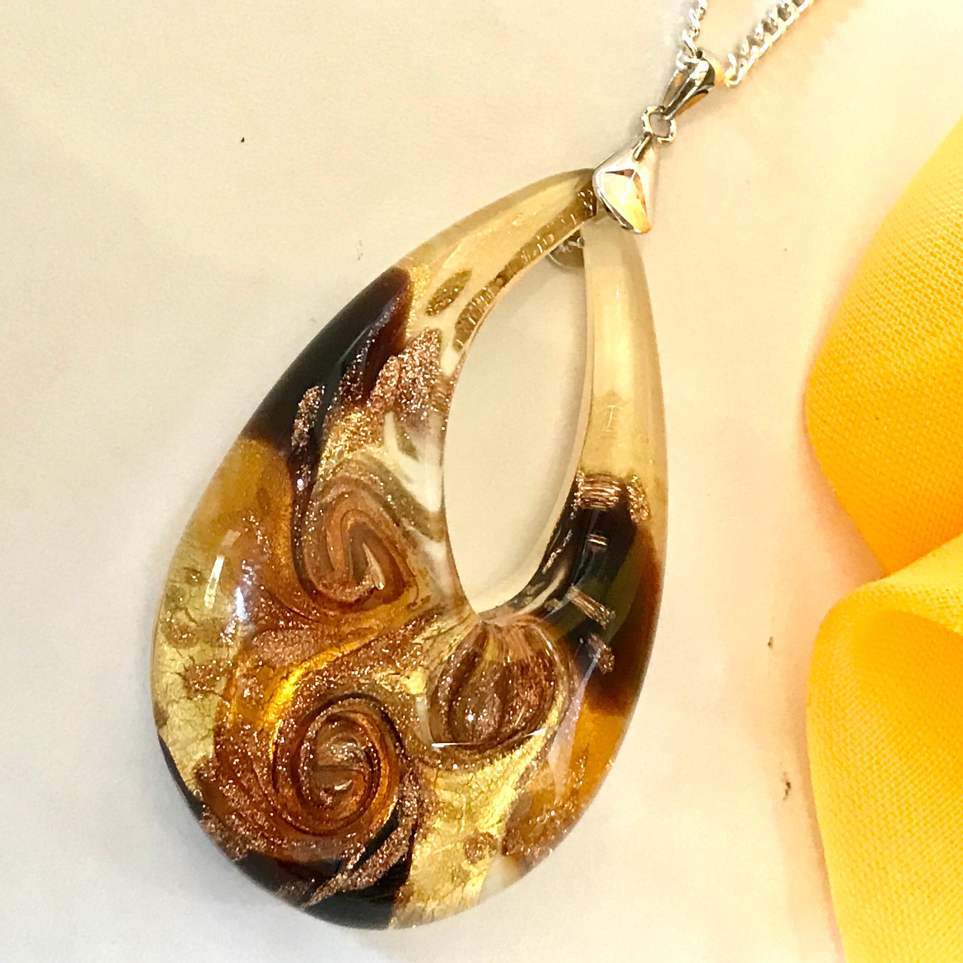 Yellow golden avventurina necklace real Murano Glass open teardrop pendant