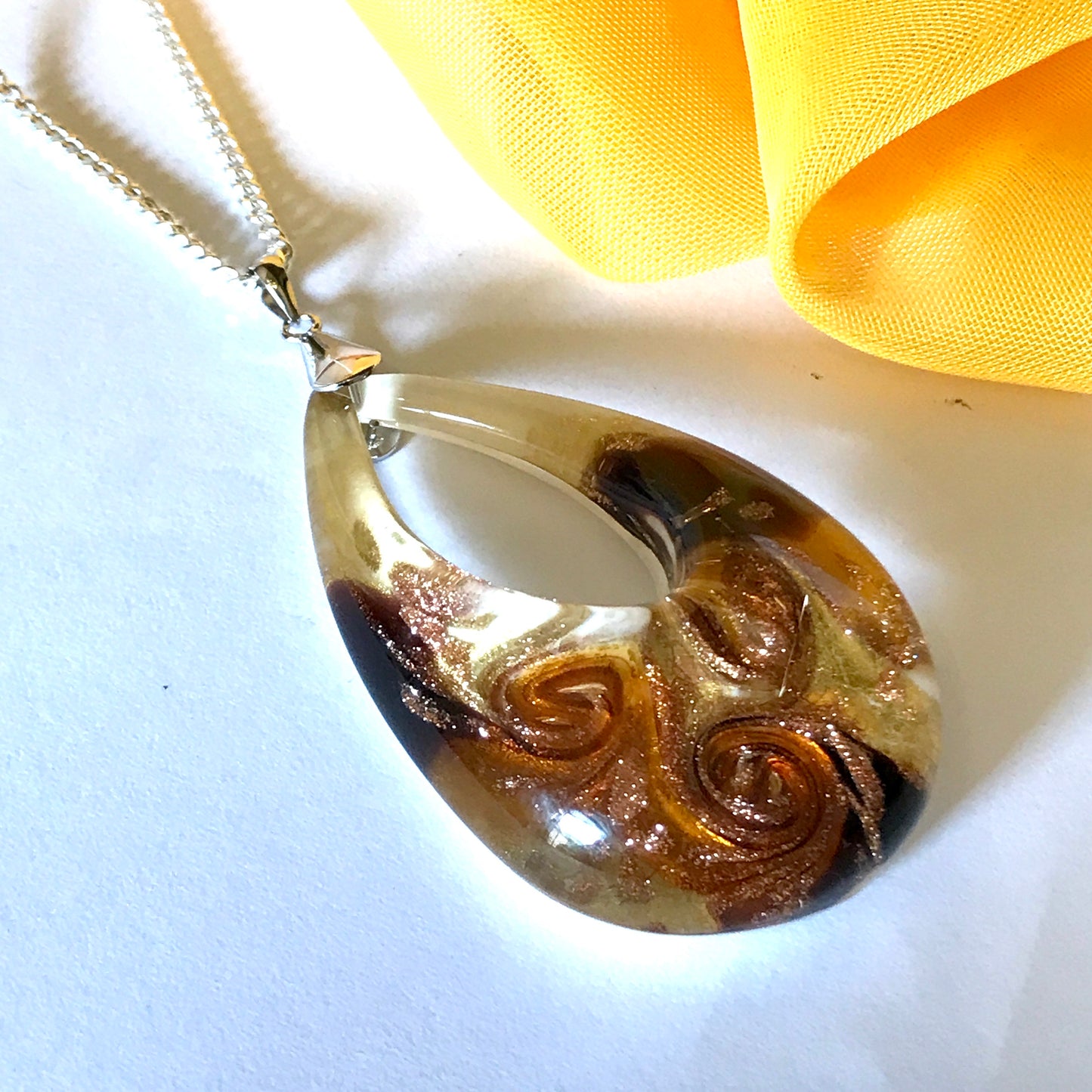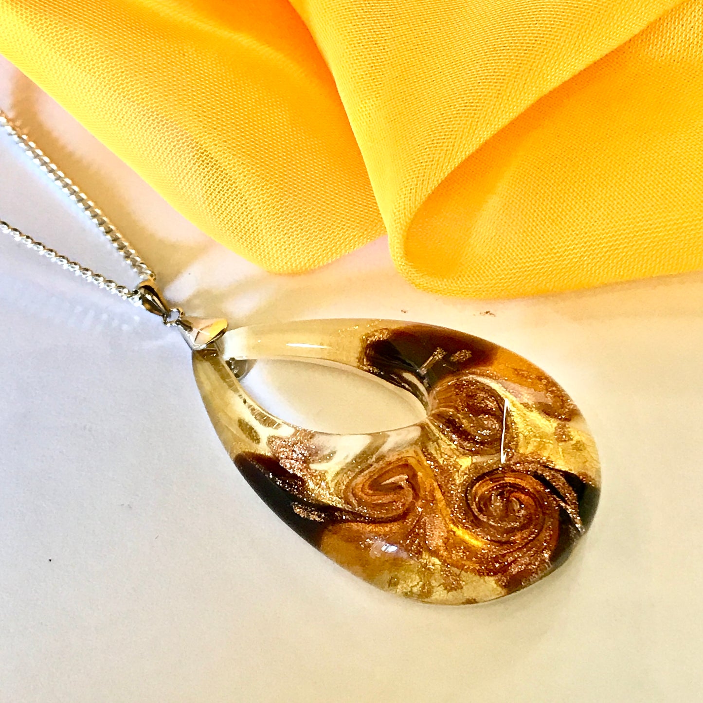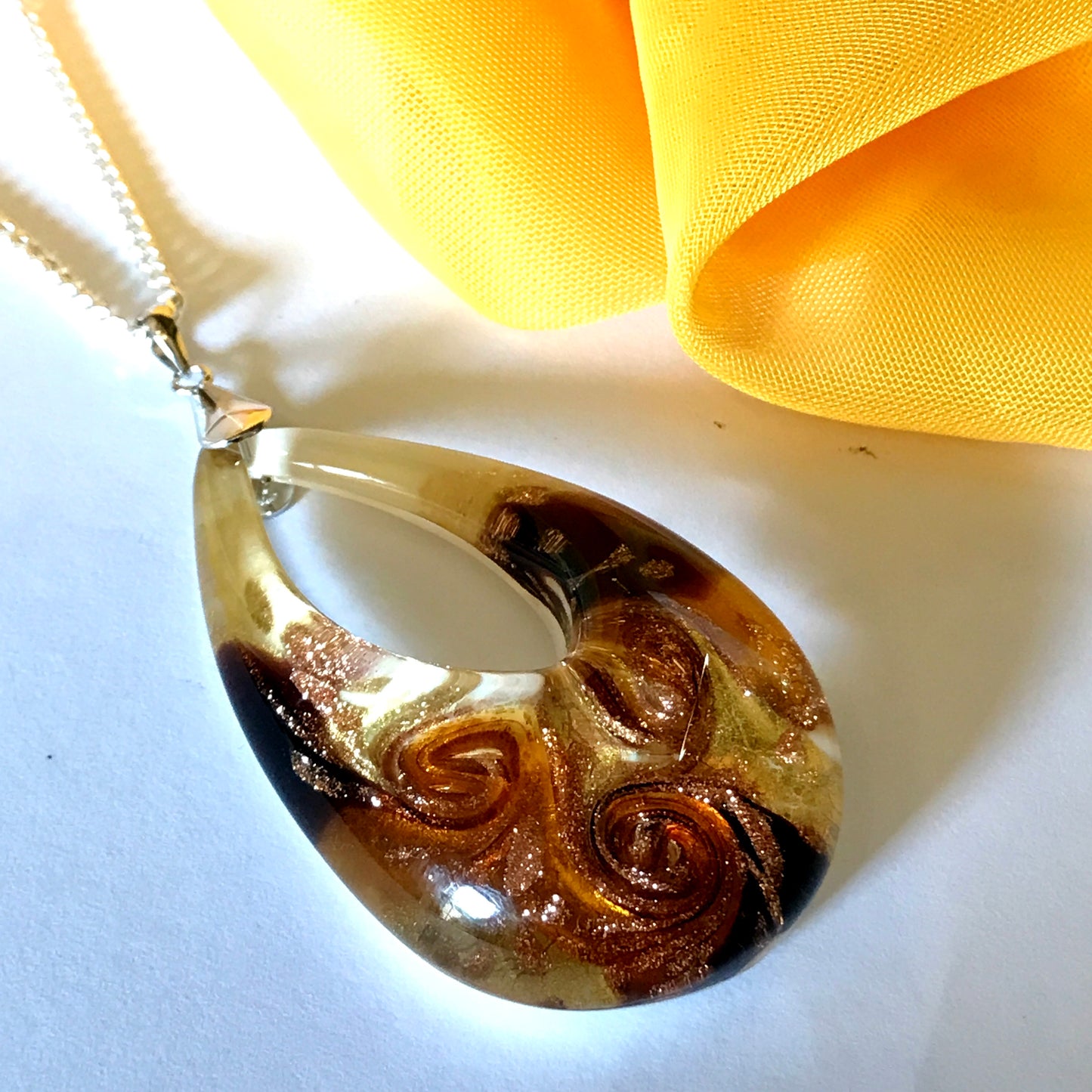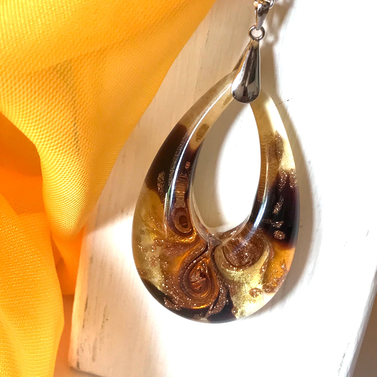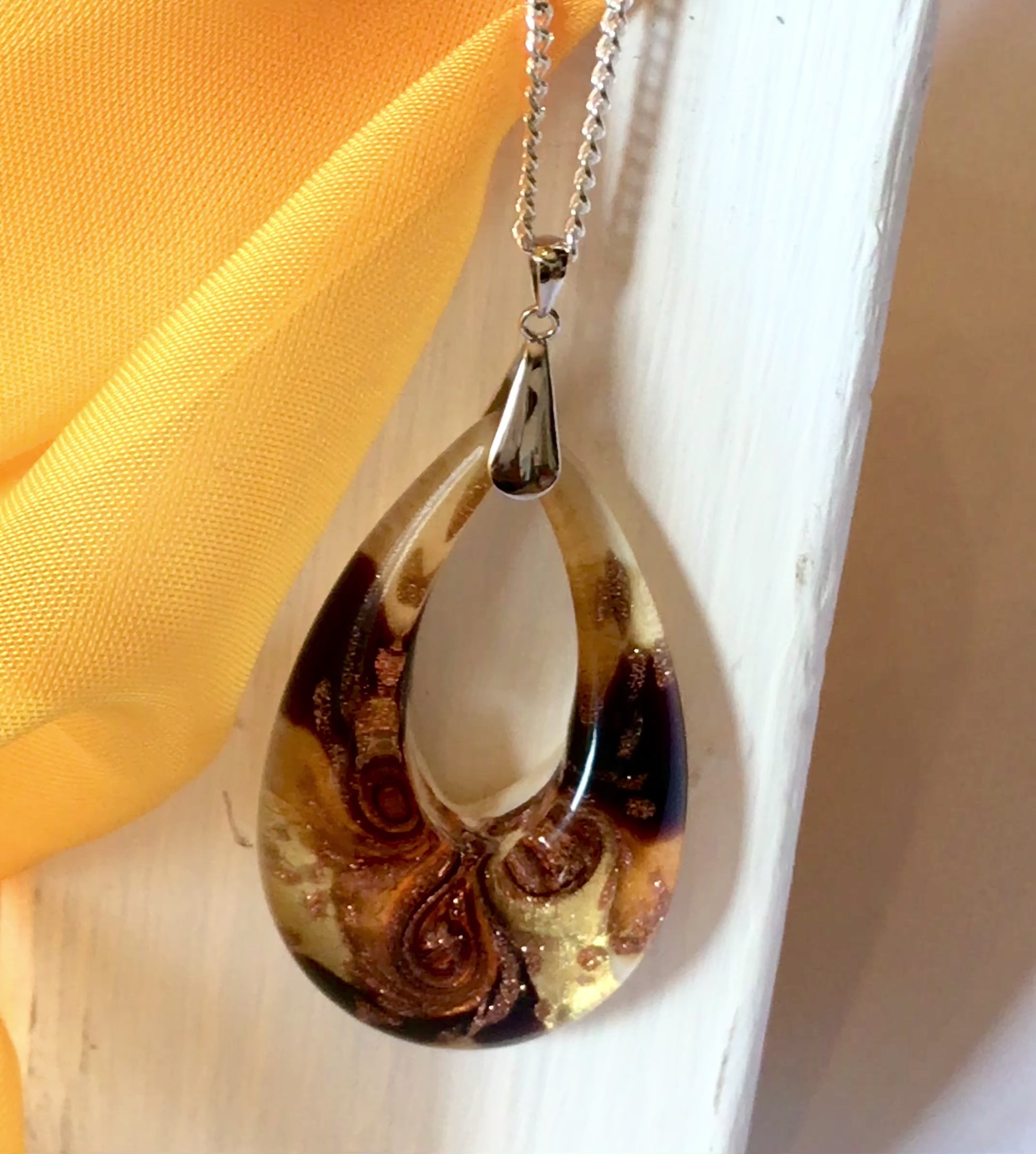 Yellow golden avventurina necklace real Murano Glass open teardrop pendant